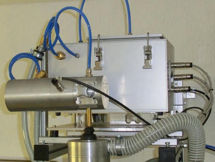 Dust feeder NDF100-3FI with injector dispersing unit Dust feed rate of up to approx. 10 kg/h depending on dust properties On platform balance with Additional dust container for approx. 25 liters